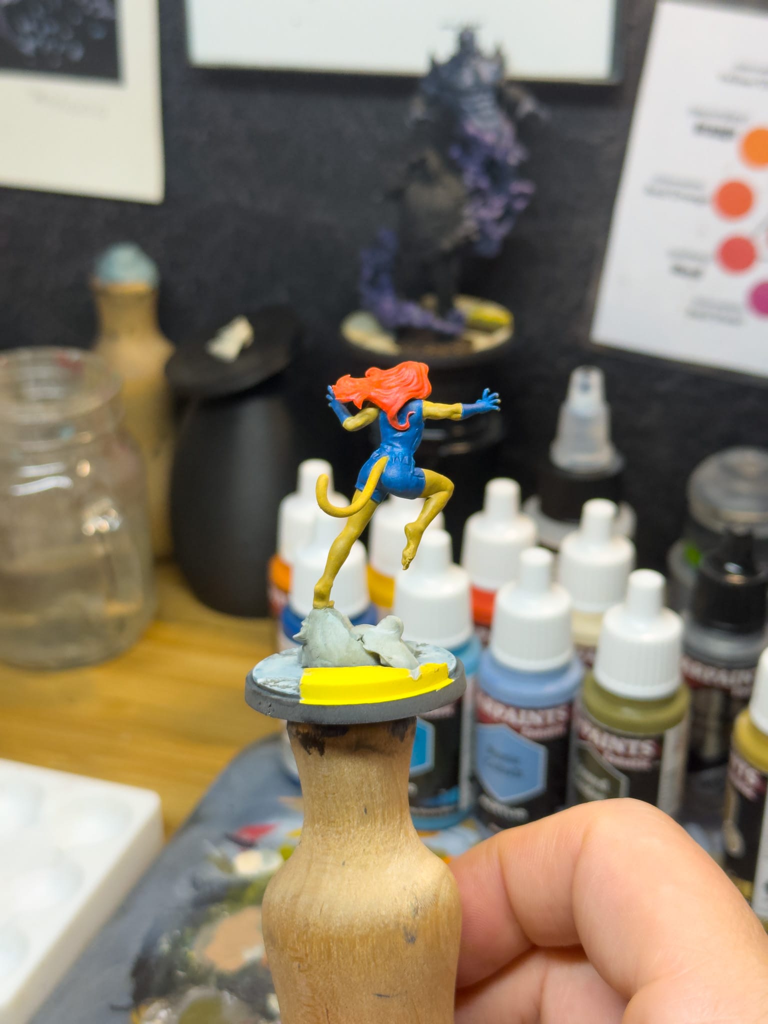 For Tigra, I used traditional painting techniques. Desert Yellow for the skin, Lava Orange for the hair, and Imperial Navy for the darker part of the costume. On the white part of the costume, I thinned down Runic Cobalt and mixed it with the navy to get a dark yet pale tone. I’ll be working up to my highlights with this choice.