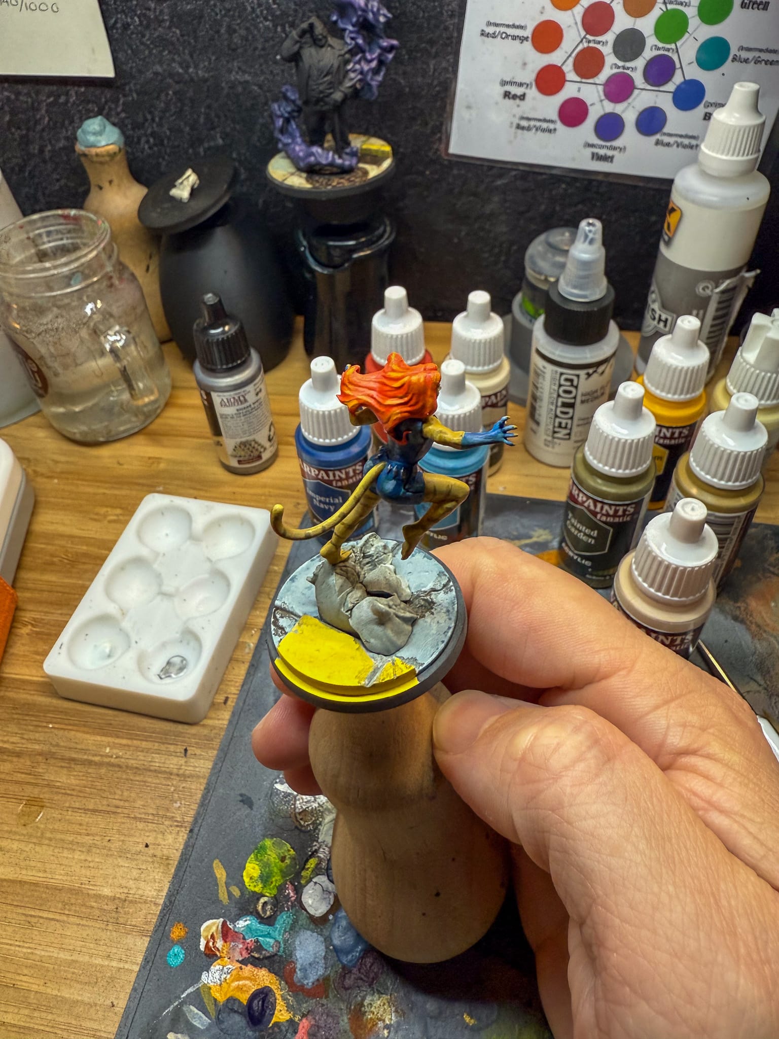 On Tigra’s hair, Lava Orange and Ice Yellow helped build up my mid tone. For her skin, Ice Yellow and Desert Yellow started to build up that mid tone, focused on all of the musculature. Lucky for me, her sculpture has a lot of little raised areas that make it easy to create visual interest.