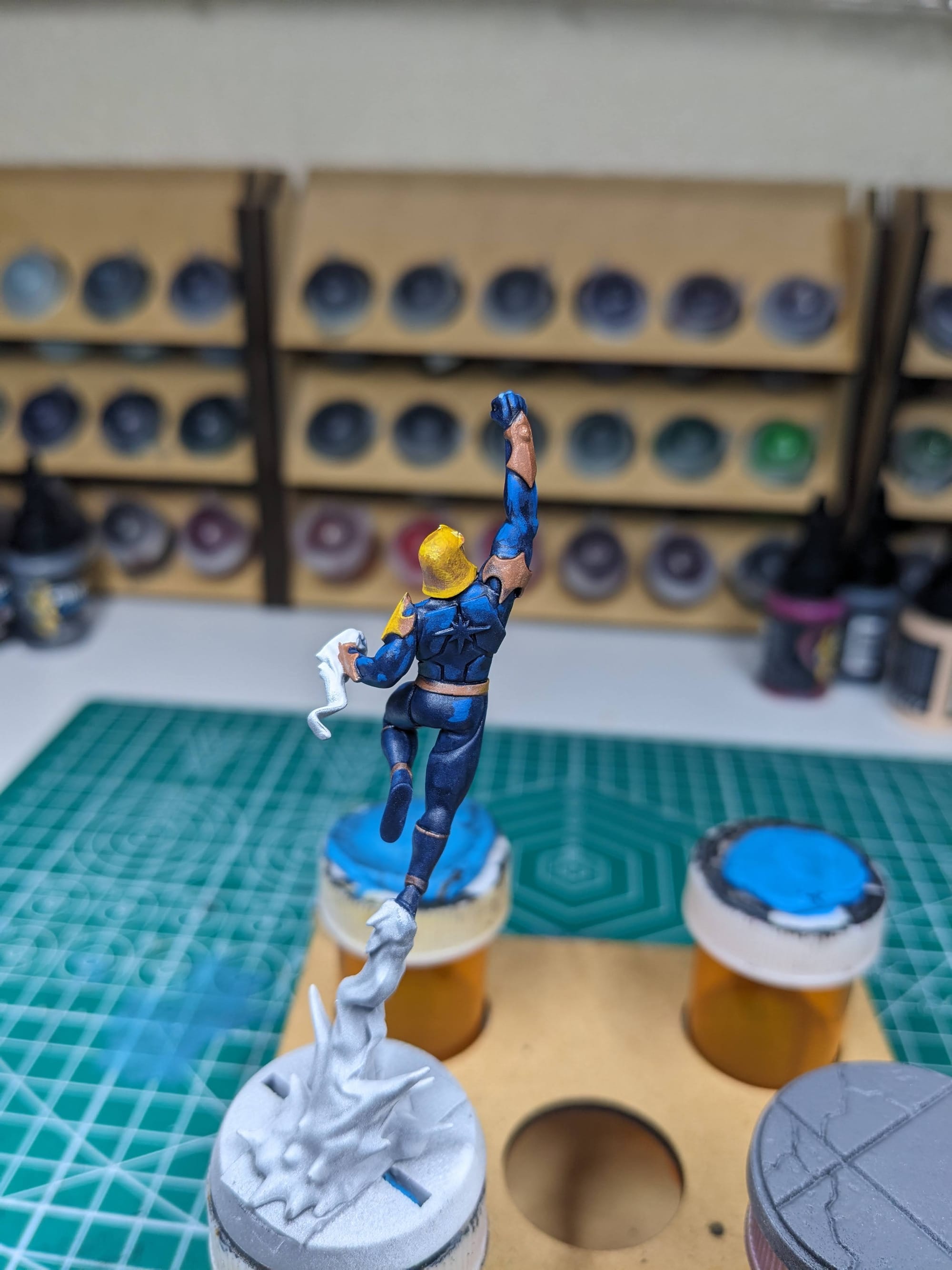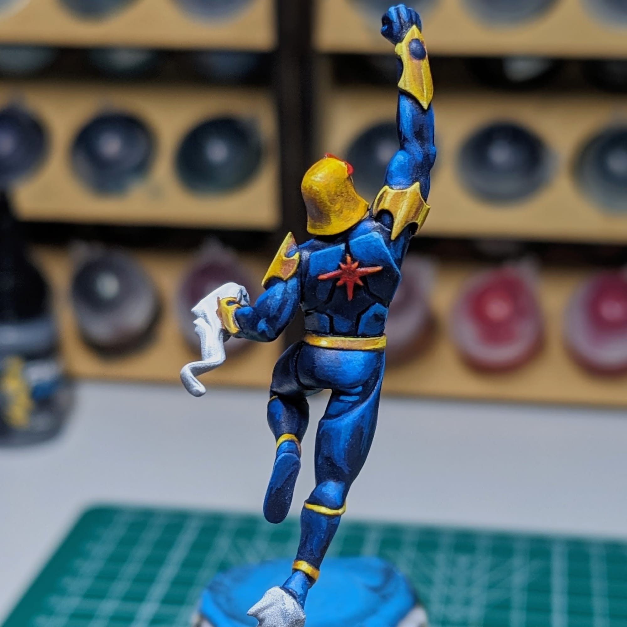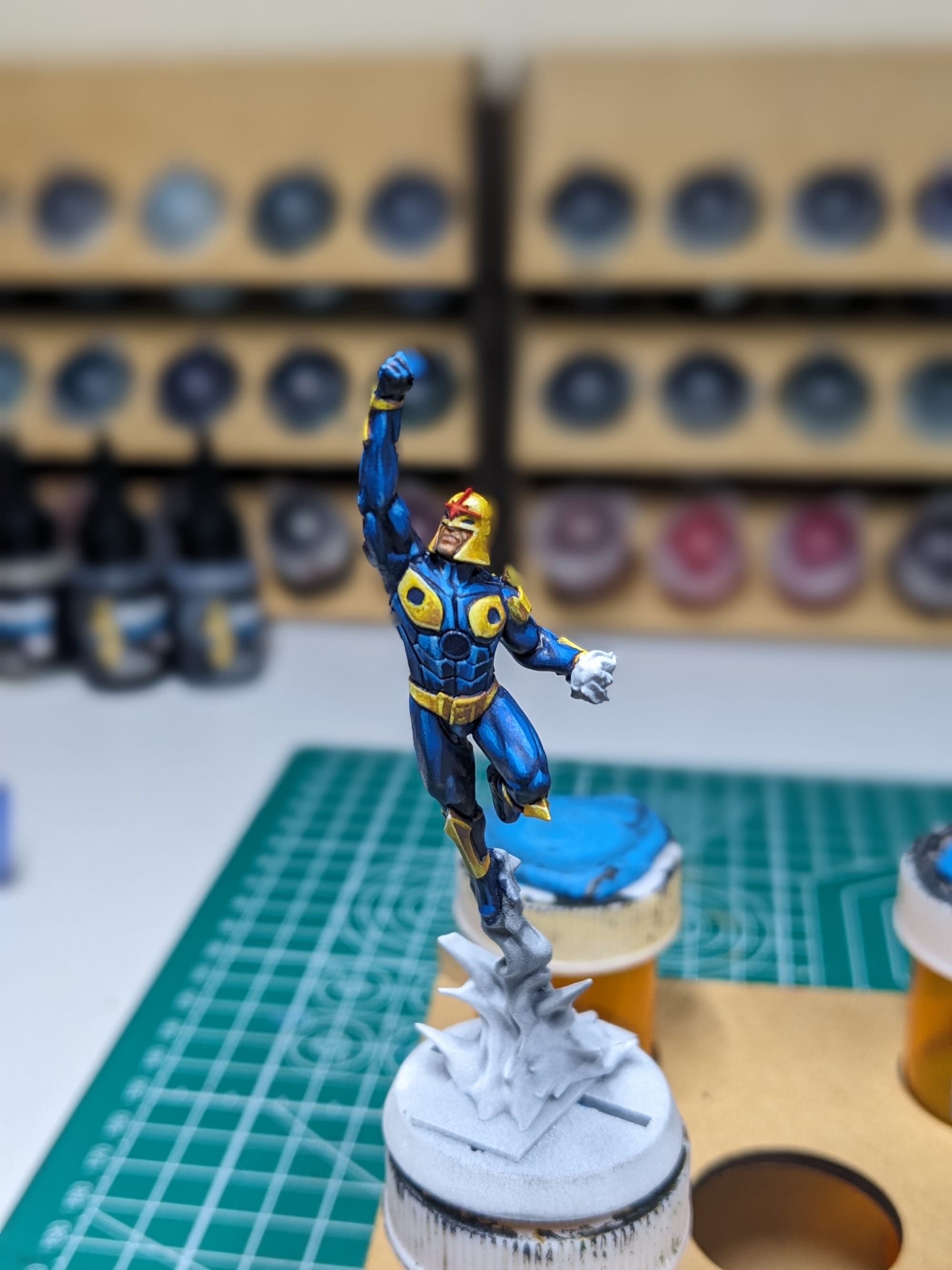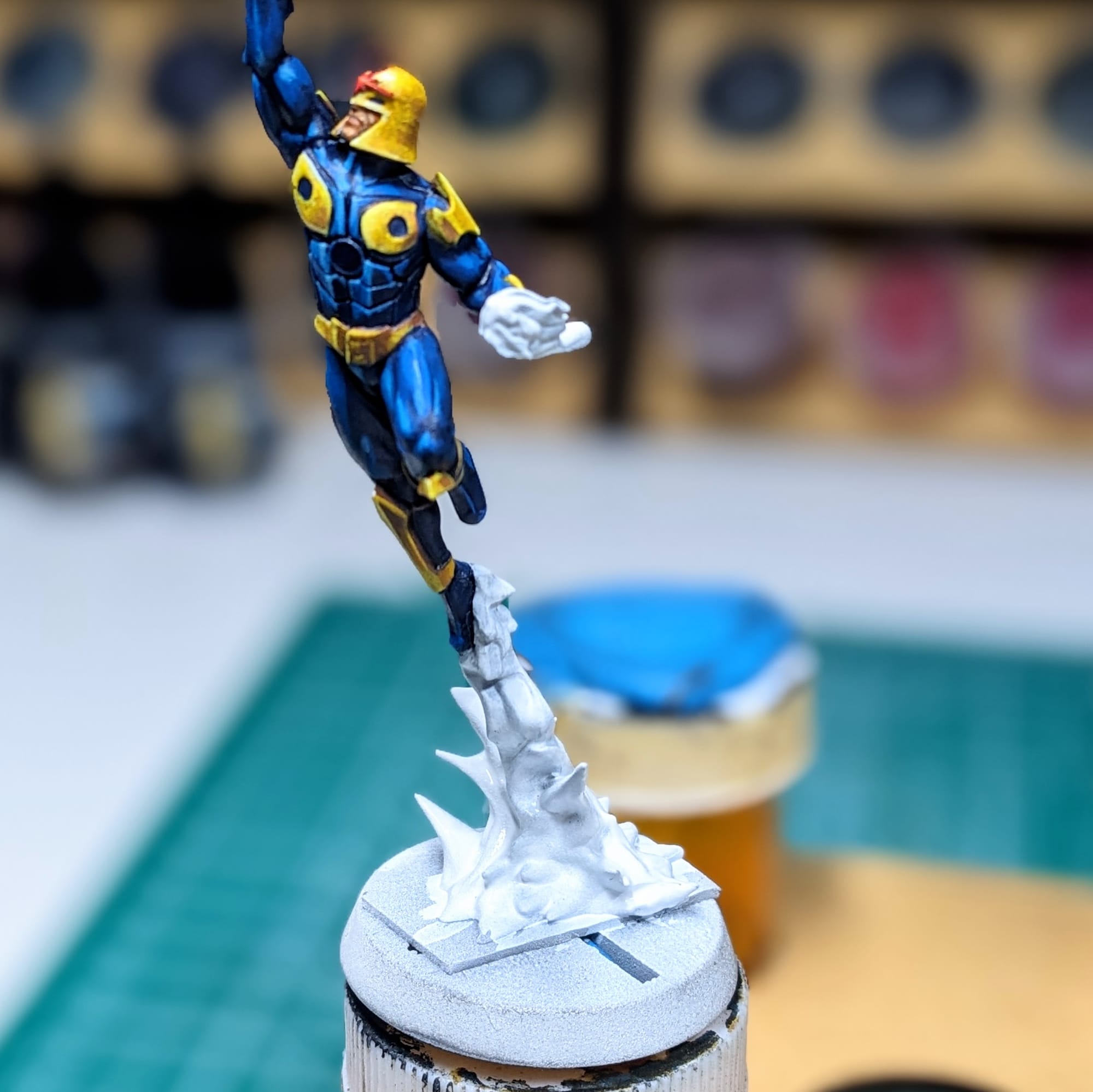 I was really excited to jump in and paint up Nova and spend some time experimenting on the non-metallic gold. The blue suit was really pretty straight-forward to highlight given how angular the pose and suit accents were. I struggled a little bit with the blue energy glows, just due to the fact I had to mix and make a blue glaze. If I were to do that again, I would utilize a fluorescent paint or a light-blue speed paint instead. I didn’t rush any part of this, and because I had the figure separate from the base, it really made everything go smoothly.