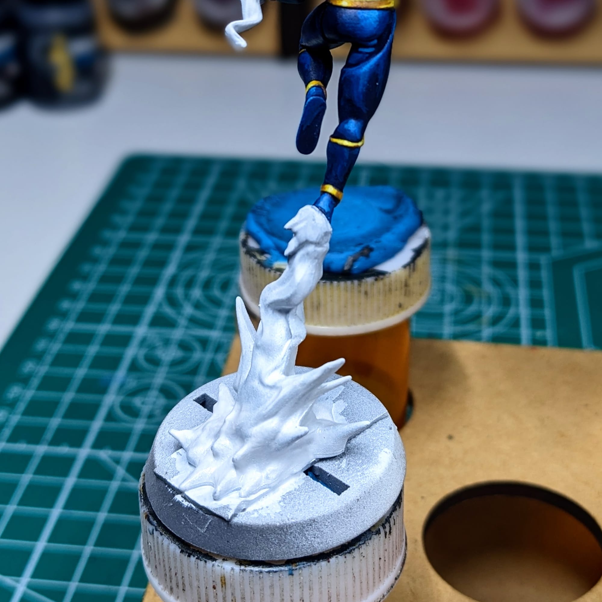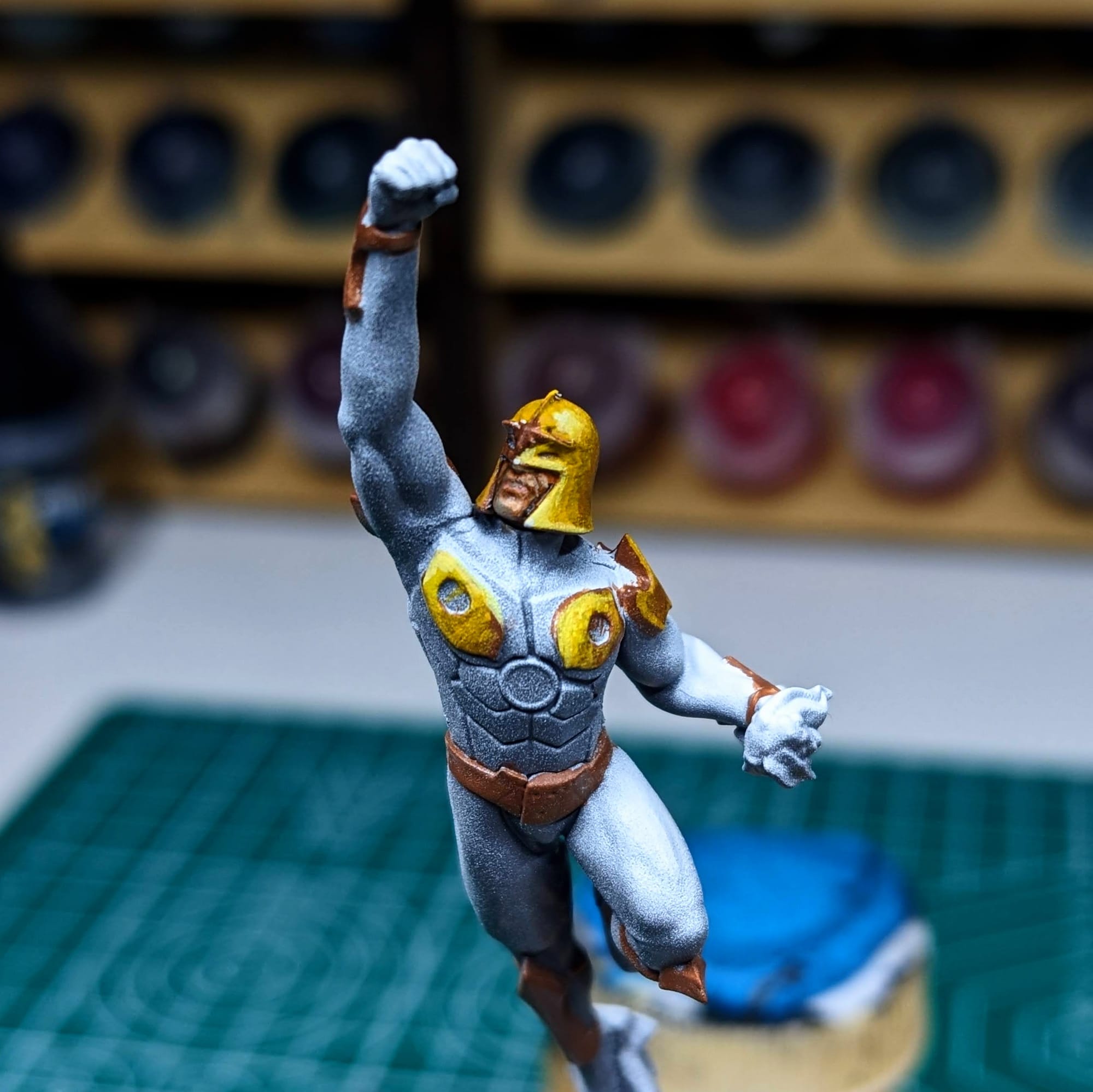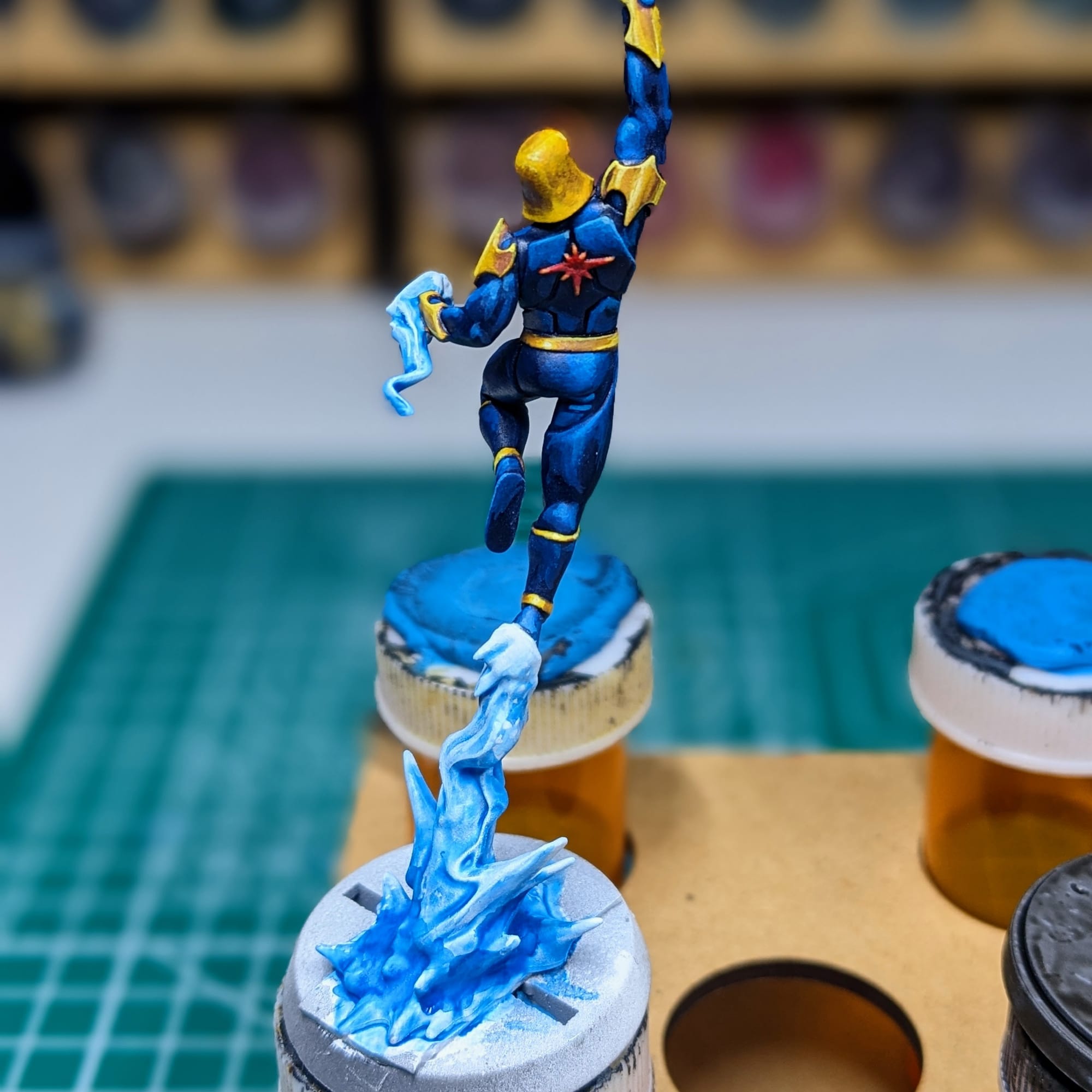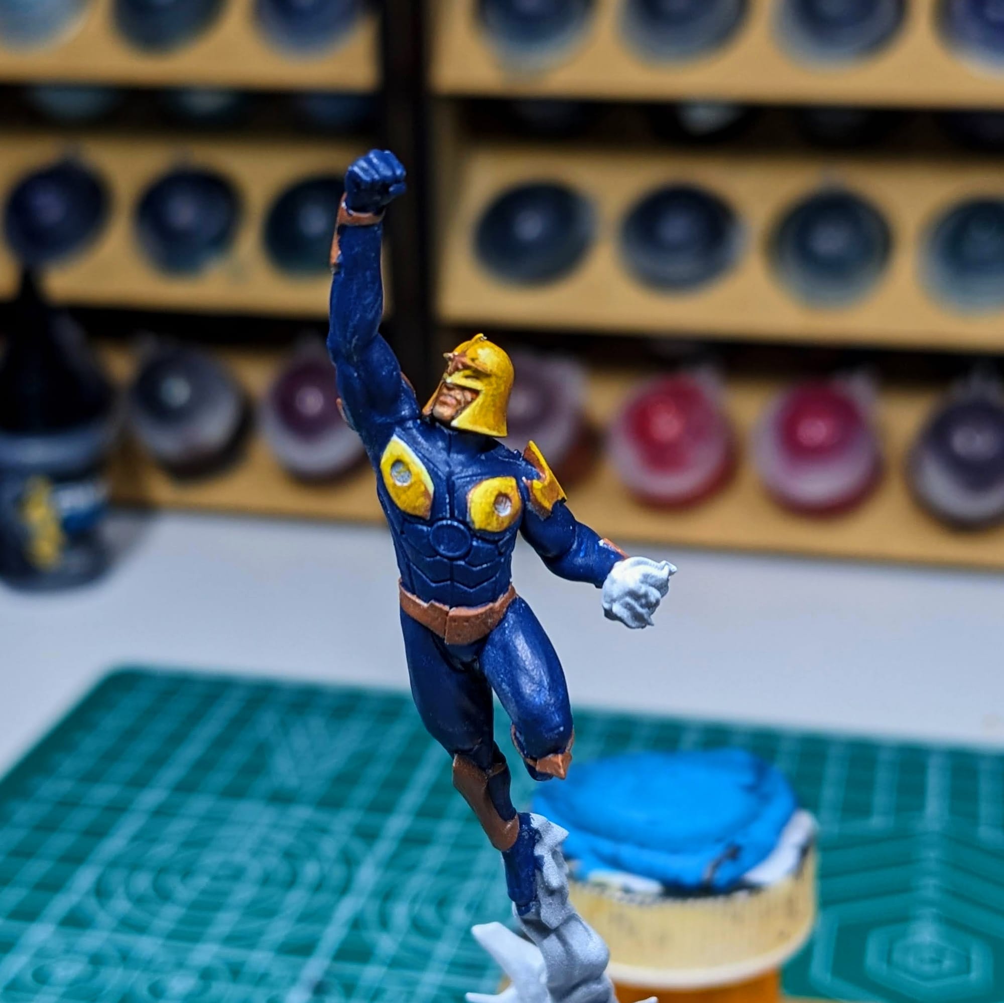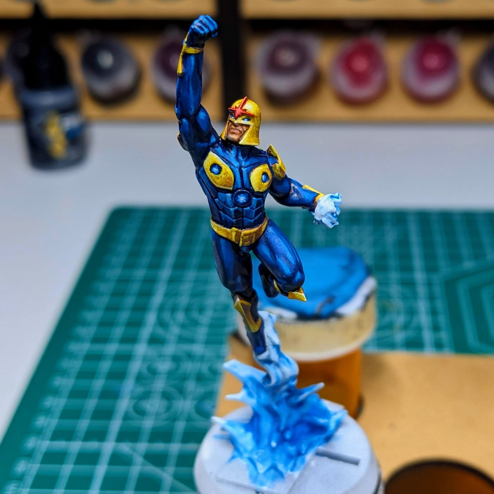 I was really excited to jump in and paint up Nova and spend some time experimenting on the non-metallic gold. The blue suit was really pretty straight-forward to highlight given how angular the pose and suit accents were. I struggled a little bit with the blue energy glows, just due to the fact I had to mix and make a blue glaze. If I were to do that again, I would utilize a fluorescent paint or a light-blue speed paint instead. I didn’t rush any part of this, and because I had the figure separate from the base, it really made everything go smoothly.