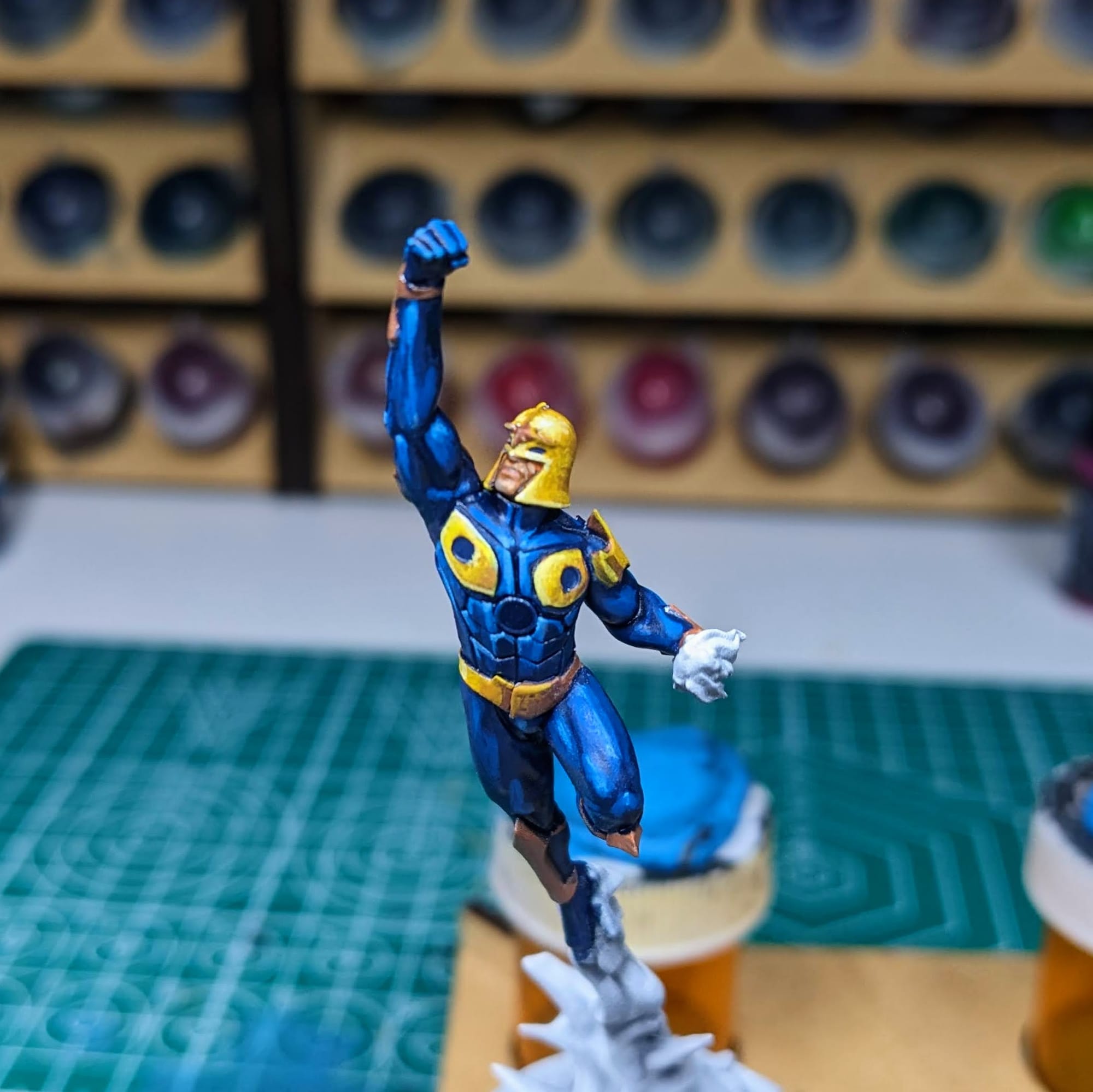 The blue suit covers 90% of the model, including the spandex for his legs and the faux-armor on his chest and back. This gave me a lot of different angles and shapes to work with, which was a lot of fun. I applied two thin coats of the Dark Navy blue before adding in Payne’s Grey Wash. From there, I highlighted the high points on the legs/feet and armor with Dark Navy Blue, Blue, and Bright Green Blue. I didn’t want to add any white in just so I didn’t wash out the gold highlights. Bright Green Blue did the work to help highlight the right fist and left leg.