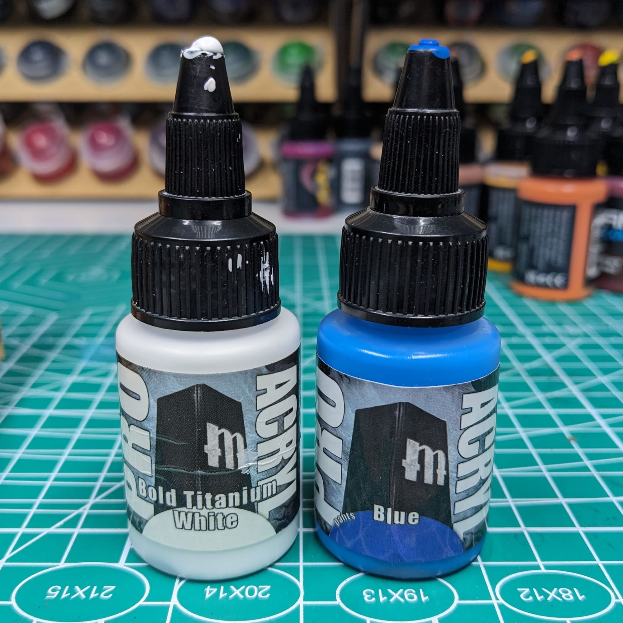 This was the trickiest section. Normally, with something like this, I would definitely utilize a glaze or a contrast paint to blend the white to blue. However, sticking with paints only found in sets, I used Bold Titanium White with just the tiniest dab of Blue to make a very thin blue glaze. I mixed the paints together on my wet palette and used a acrylic medium to thin them down without sacrificing the pigment.