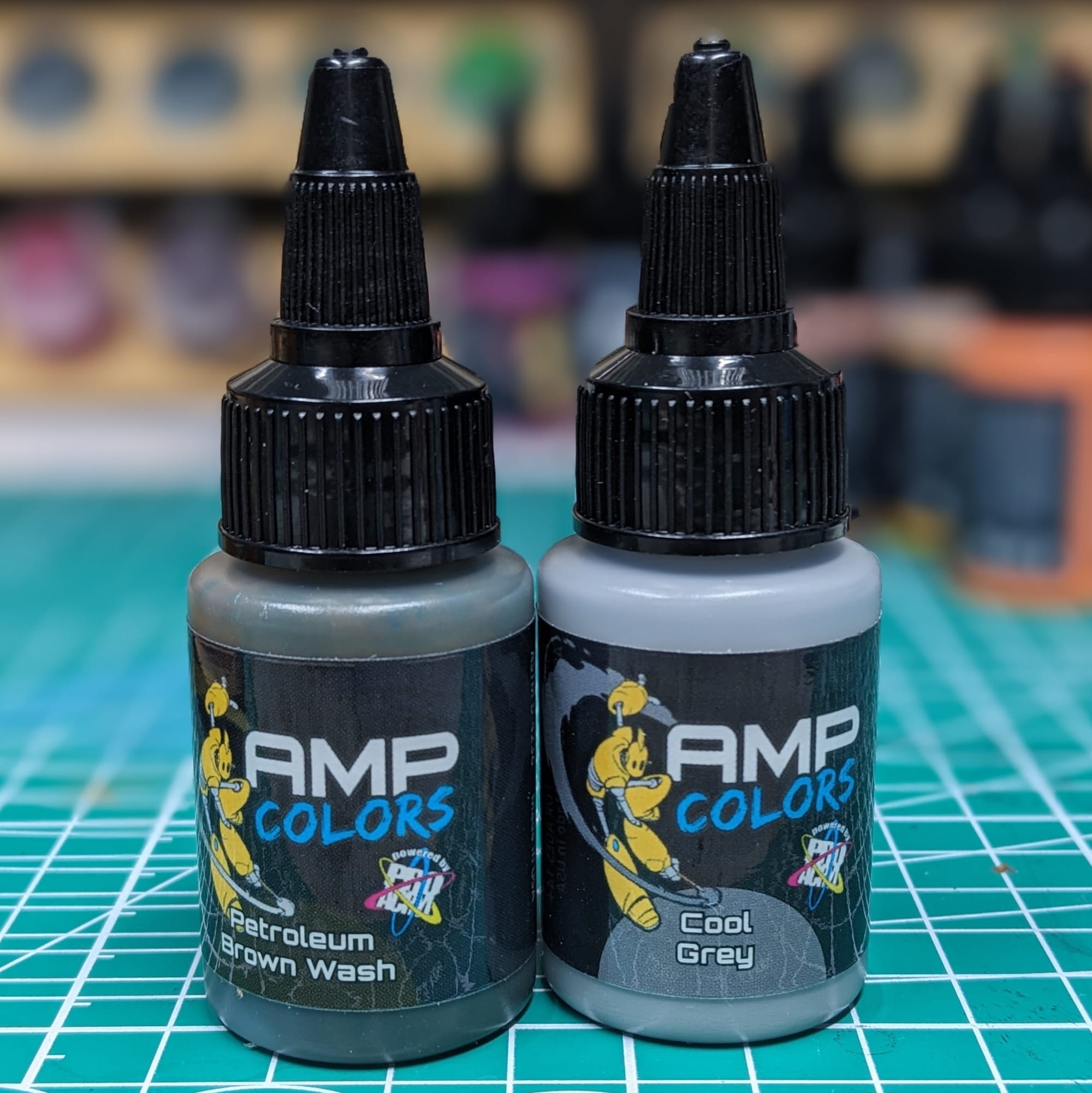 Alec: Echoing Randy, the standard four, 35mm bases provided can get really boring and repetitive to paint. I also have a standard recipe that I use for each of my city street bases, which I was able to replicate with the AMP colors. I primed the base using Rustoleum Flat Gray Primer. I painted, unevenly, dabs of the Cool Grey around the base and then did two medium coats of a mixture of Petroleum Brown Wash and a few small dabs of Coal Black (I mean, very, very small). After that dried, I did some light drybrushing using the Cool Grey, focusing more on the cement cracks. Finally, I painted the rim of the base using Coal Black.