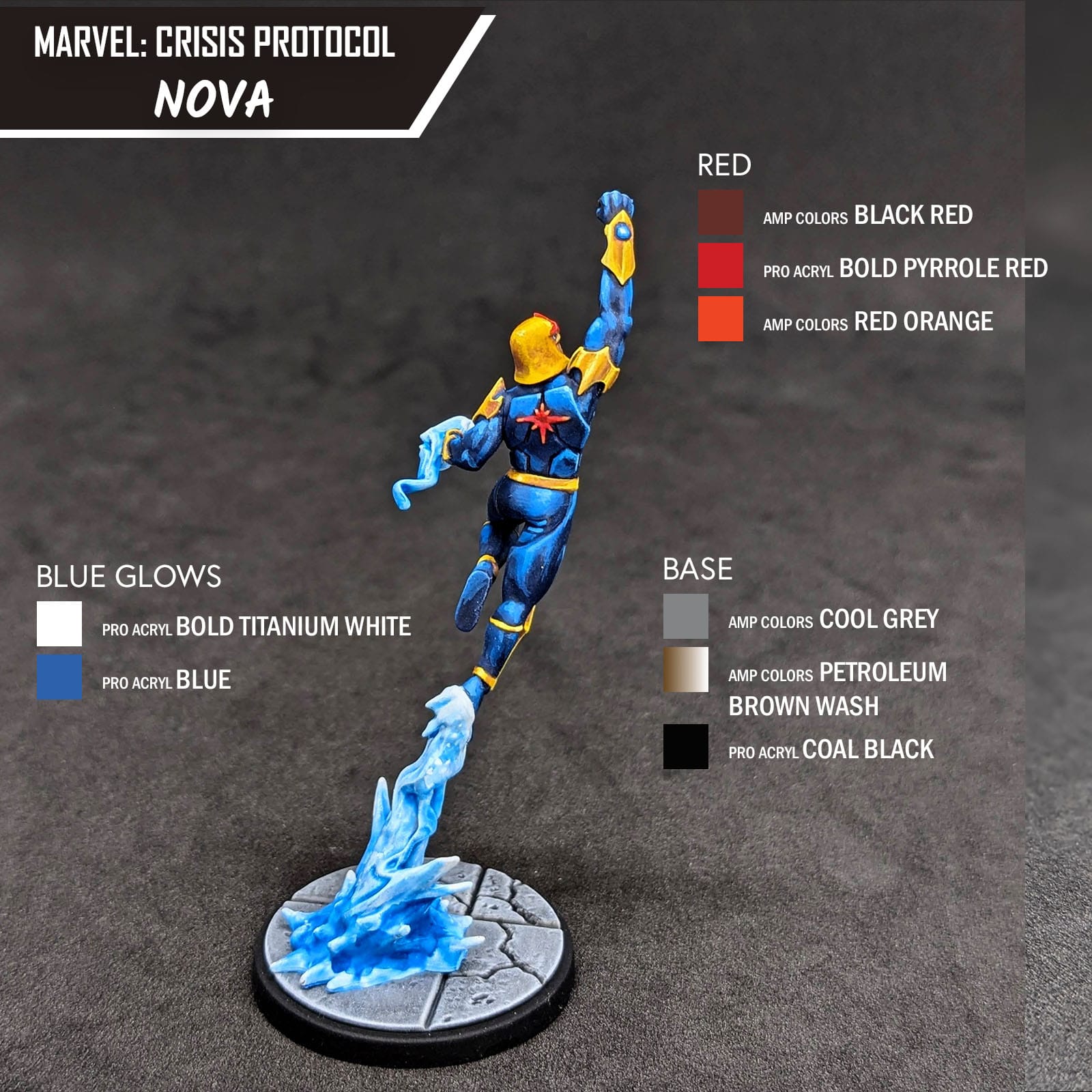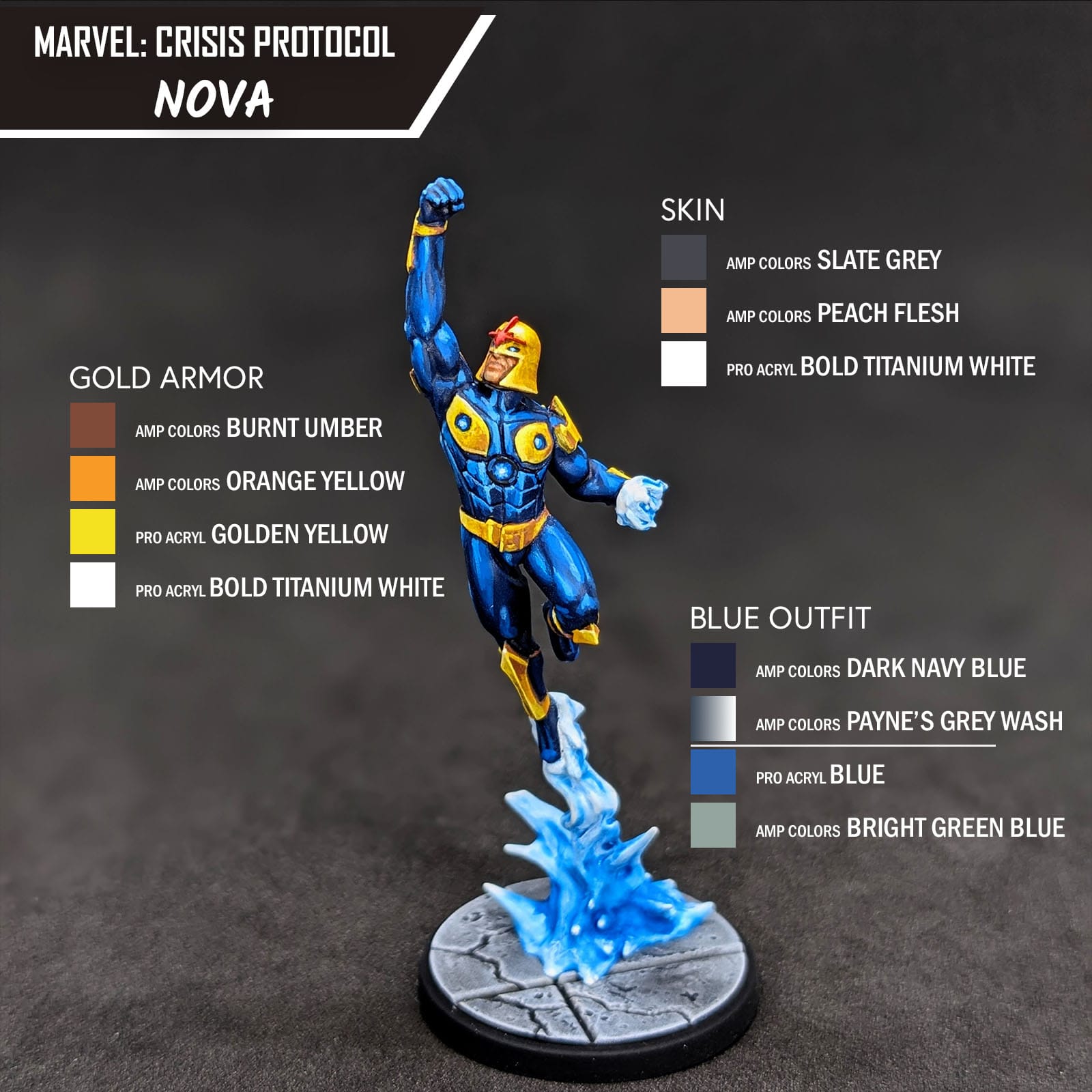 Alec: I wanted to try out the box sets on a cosmic character from Atomic Mass Games, so thought it would be appropriate to paint up Nova from the Marvel: Crisis Protocol Yondu and Nova expansion pack. I used both Cosmic Sets as well as some colors from the Pro Acryl Base Set.