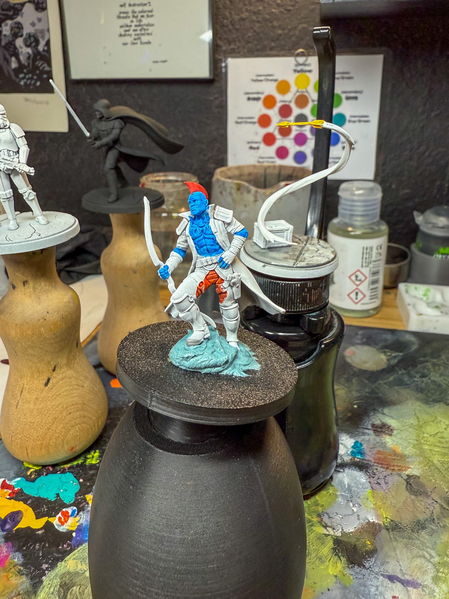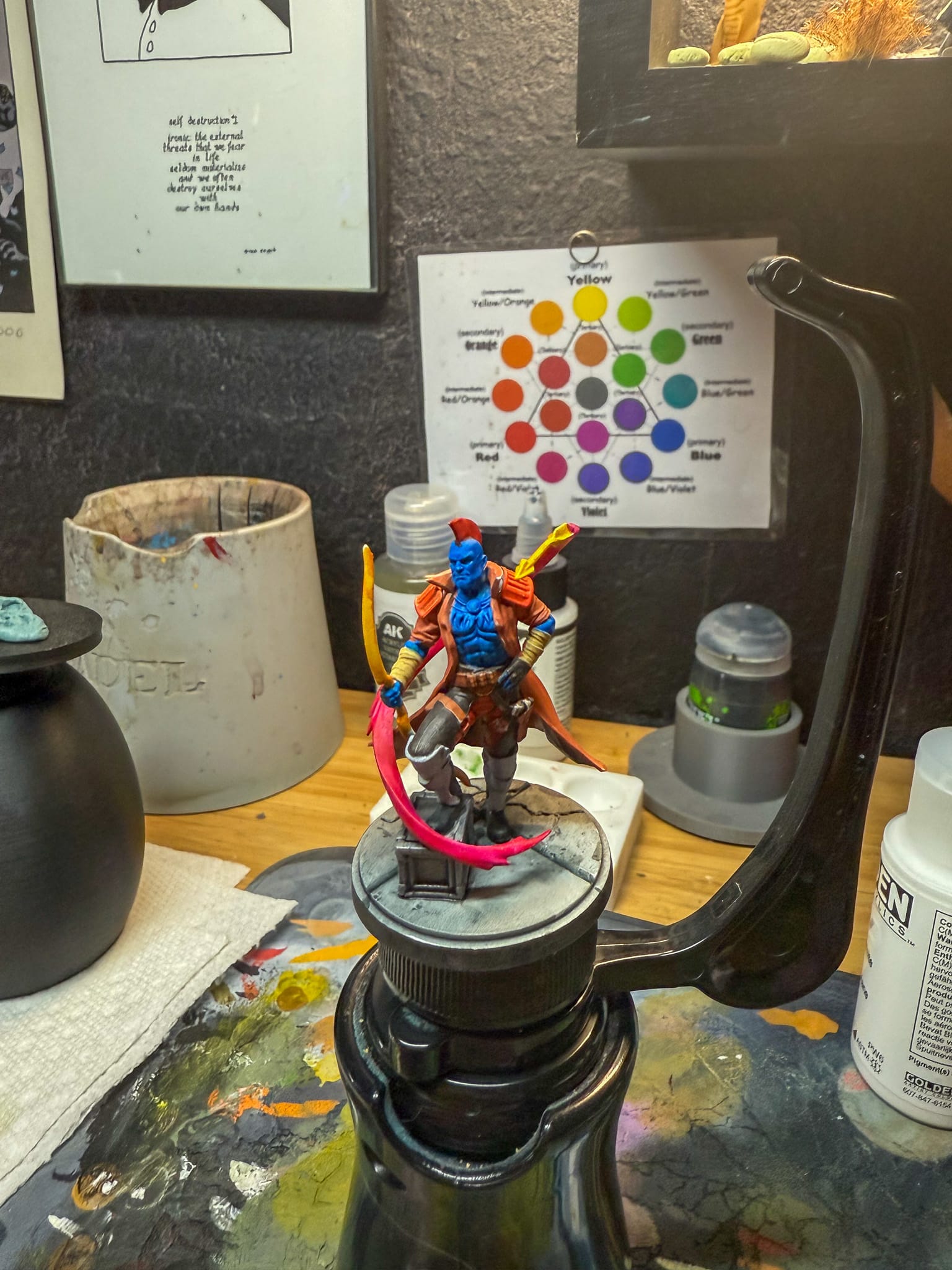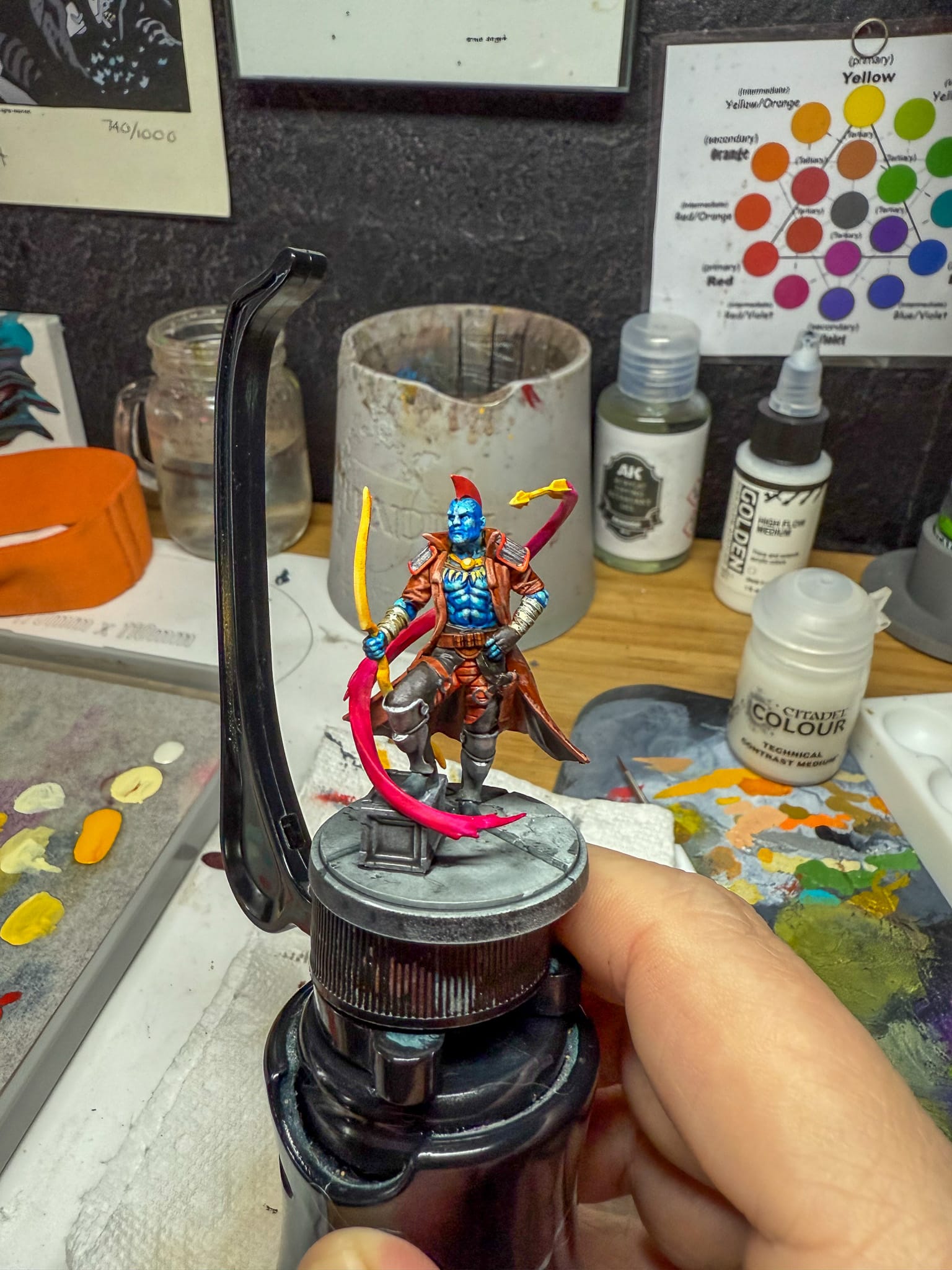 For the larger parts of the model, I used Magic Blue for the body, Blood Red for the head fin and shoulder pads, Fire Giant Orange for the underpants, Pallid Bone for the wraps, Hardened leather for the belts, Zealot Yellow for the bow and arrow, and lastly, Polished Silver for his shin guards & base box, all from the Army Painter speedpaint range. I found these colors all gave me a great starting point, and with many I just needed one pass on the model.