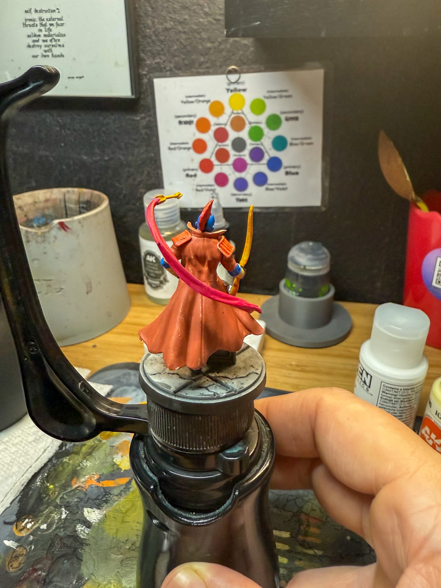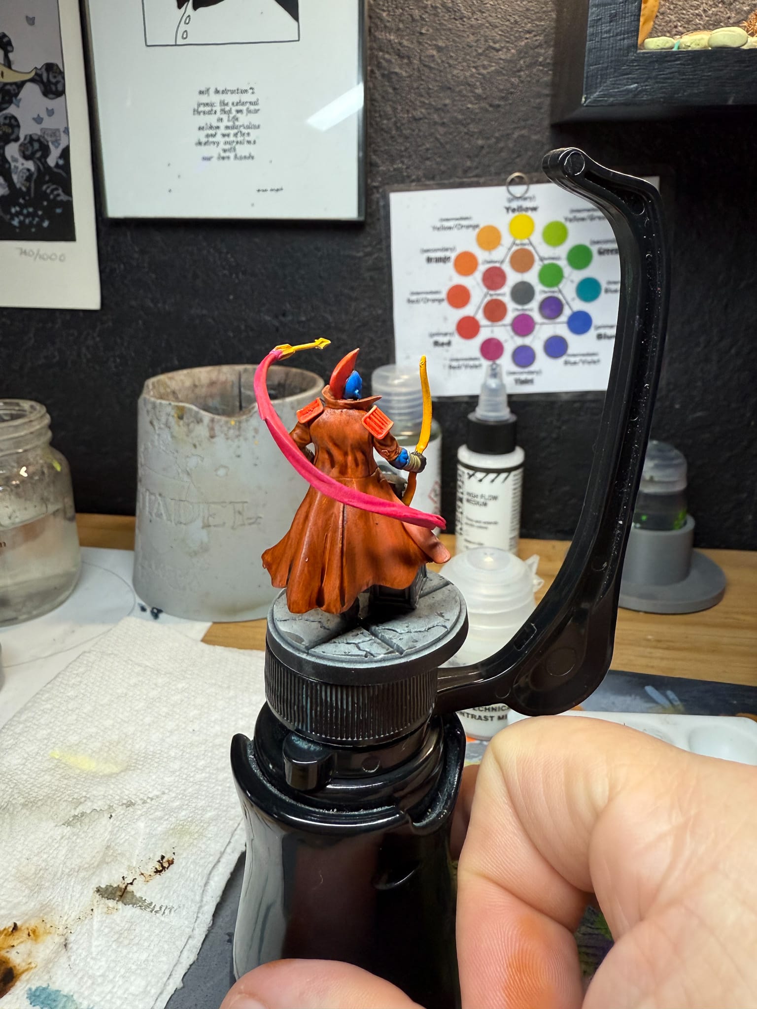 On the underside of the cloak, I mixed a more Pure Black mixture of Ruddy Brown, which gave me a shadow tone that I painted into the flat shadow areas. A little messy, but this piece is for the table, so I gave myself the grace of not going hardcore into a part of the model no one will ever see.