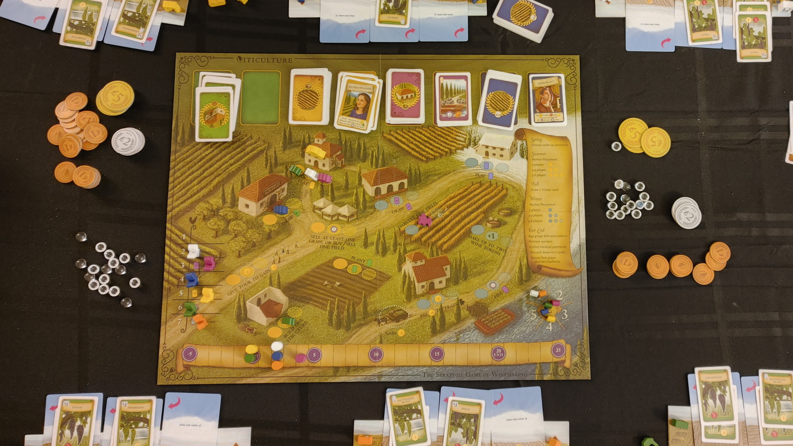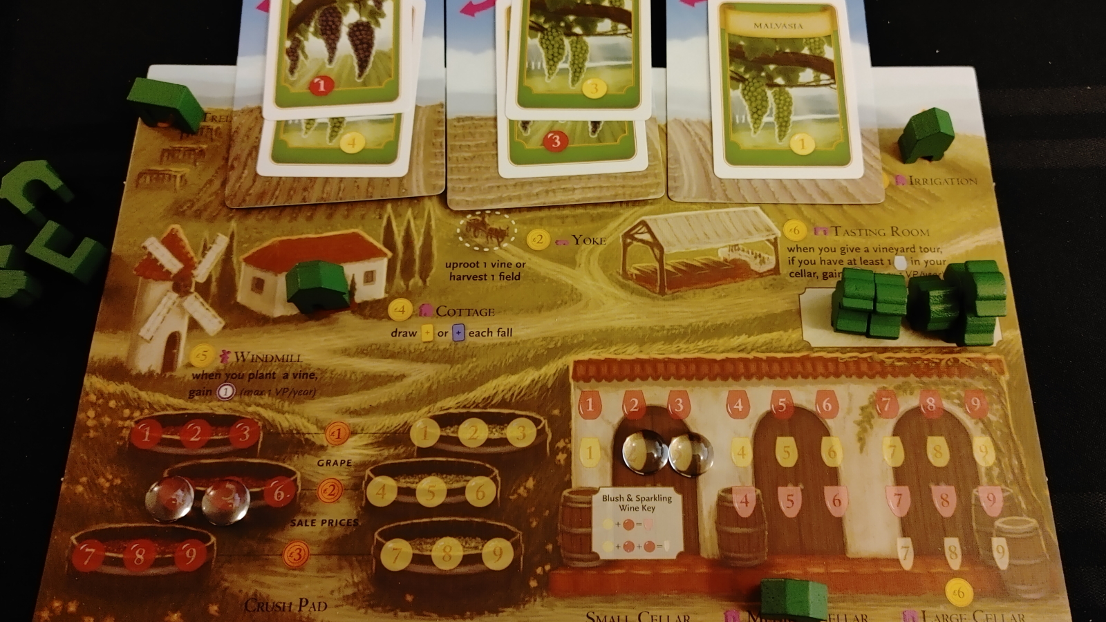 Because players start with almost nothing, the game has an interesting flow to it. At the start, the summer is the most important, with players spending almost all of their workers to build their infrastructure, plant their grapes, and make the money to do those things. However, once that work is done, players can almost skip summer entirely, as the harvest and wine-making becomes the most important part. This shift happens in the economy as well, as cash becomes almost pointless by the end of the game, with grapes, wine, and victory points becoming the currencies of choice.