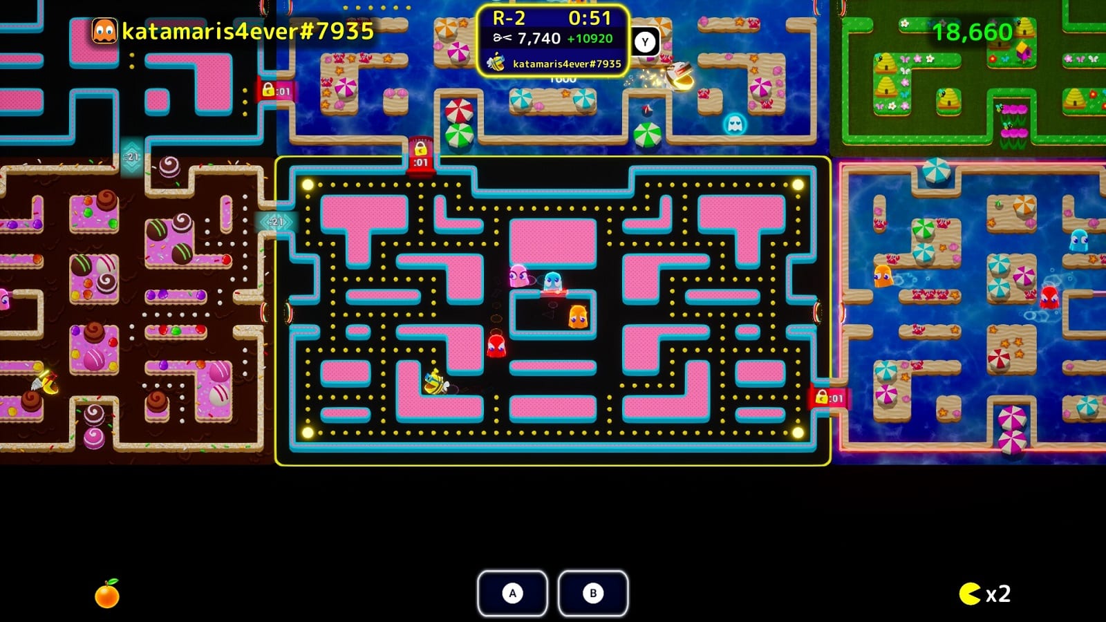 As I’ve noted in my preview beforehand, Pac-Man Mega Tunnel Battle is an innovative concept that needs more work in order to succeed. Did it do so? Well, yes and no. The main gameplay mode is elimination, where you are trying to be the last Pac-Man standing in a group of 64-players. Each of you has a maze where you will need to try and complete, with ghosts that are threatening to kill you. Should you touch a Power Pellet, you will make them vulnerable and eat them for a lot of points. Clearing a maze will reset it and make you and the ghosts speedier, with higher value fruits in the mix to grant you a point bonus every so often.