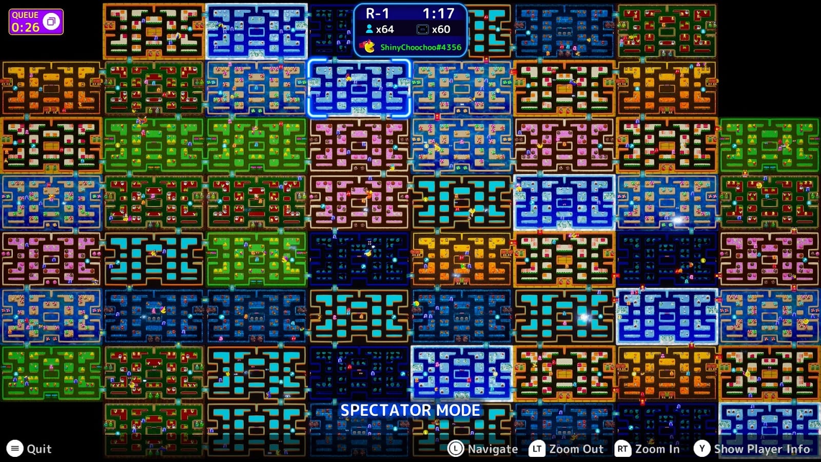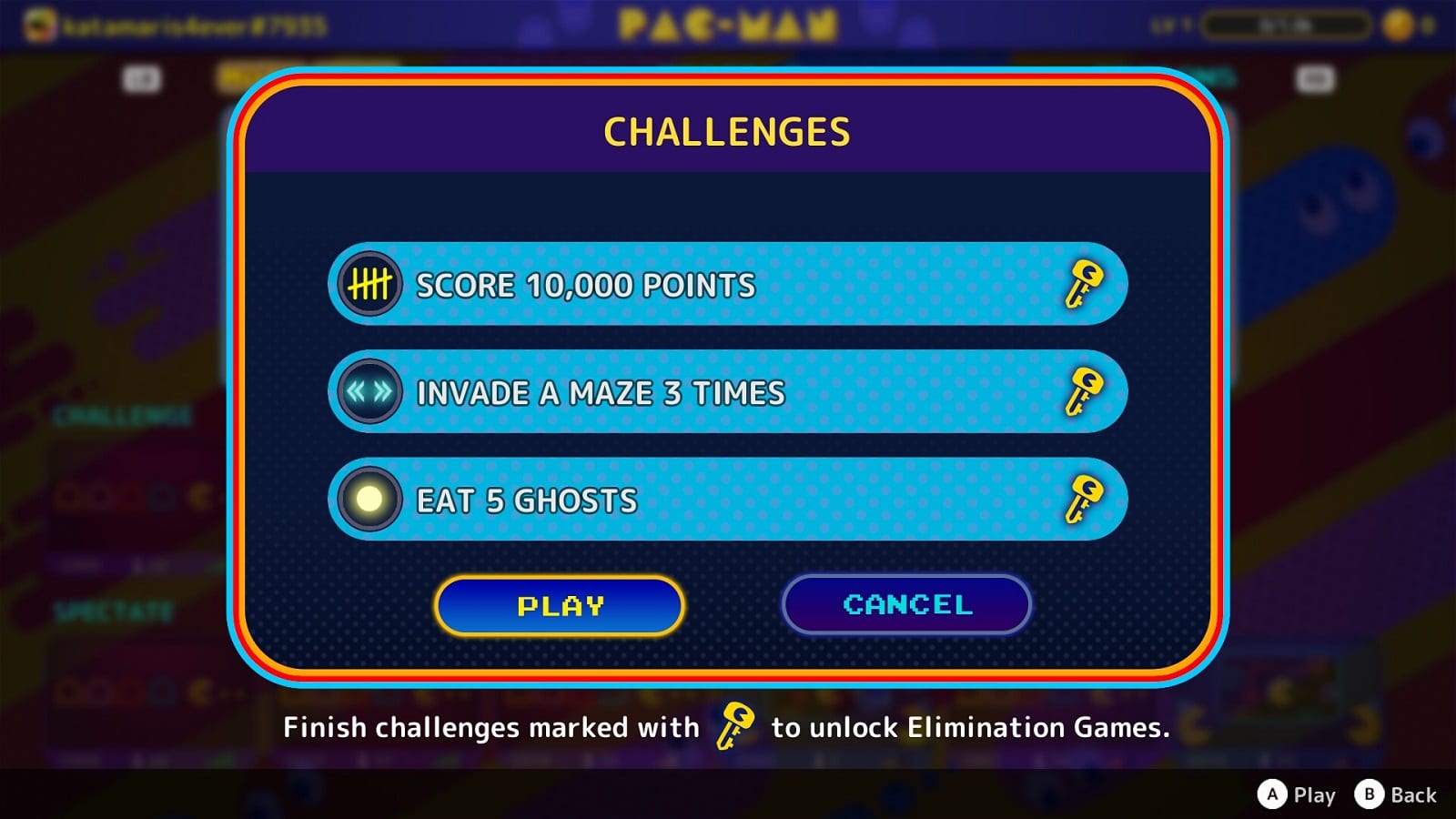 Aside from the main elimination game, there’s a separate challenge mode that functionally acts as a waiting lobby (and also a bit of an endless mode). It’s the same game except now you have goals to fulfill (like eating 5 ghosts or scoring 30,000 points in one game), and doing so will grant you experience and in-game currency that will allow you unlock customizable parts for your Pac-Man. You can also spectate either of these modes, where you’ll have the ability to get a bird’s eye view of the whole playing field and even choose which powerups appear for a certain player.